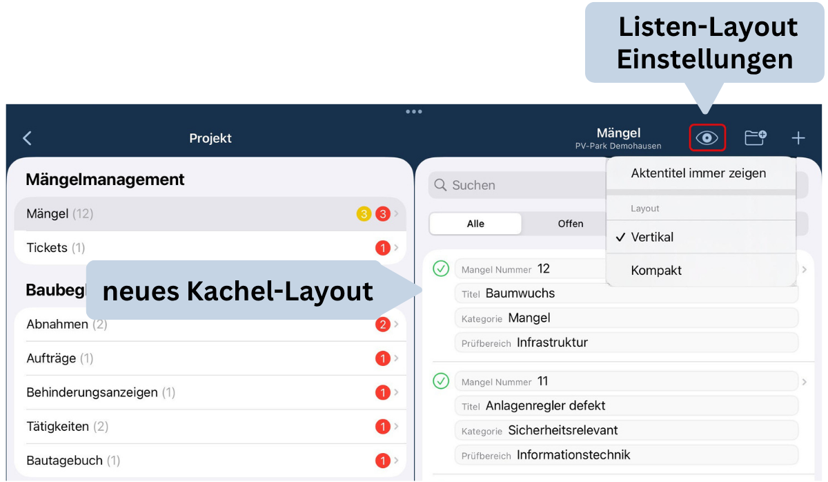 Wenn Sie in der TabTool-App eine Liste öffnen, finden Sie jetzt oben rechts in der Menüleiste ein Augen-Symbol. Dahinter finden Sie die folgenden Optionen zur Anpassung des Listen-Layouts: